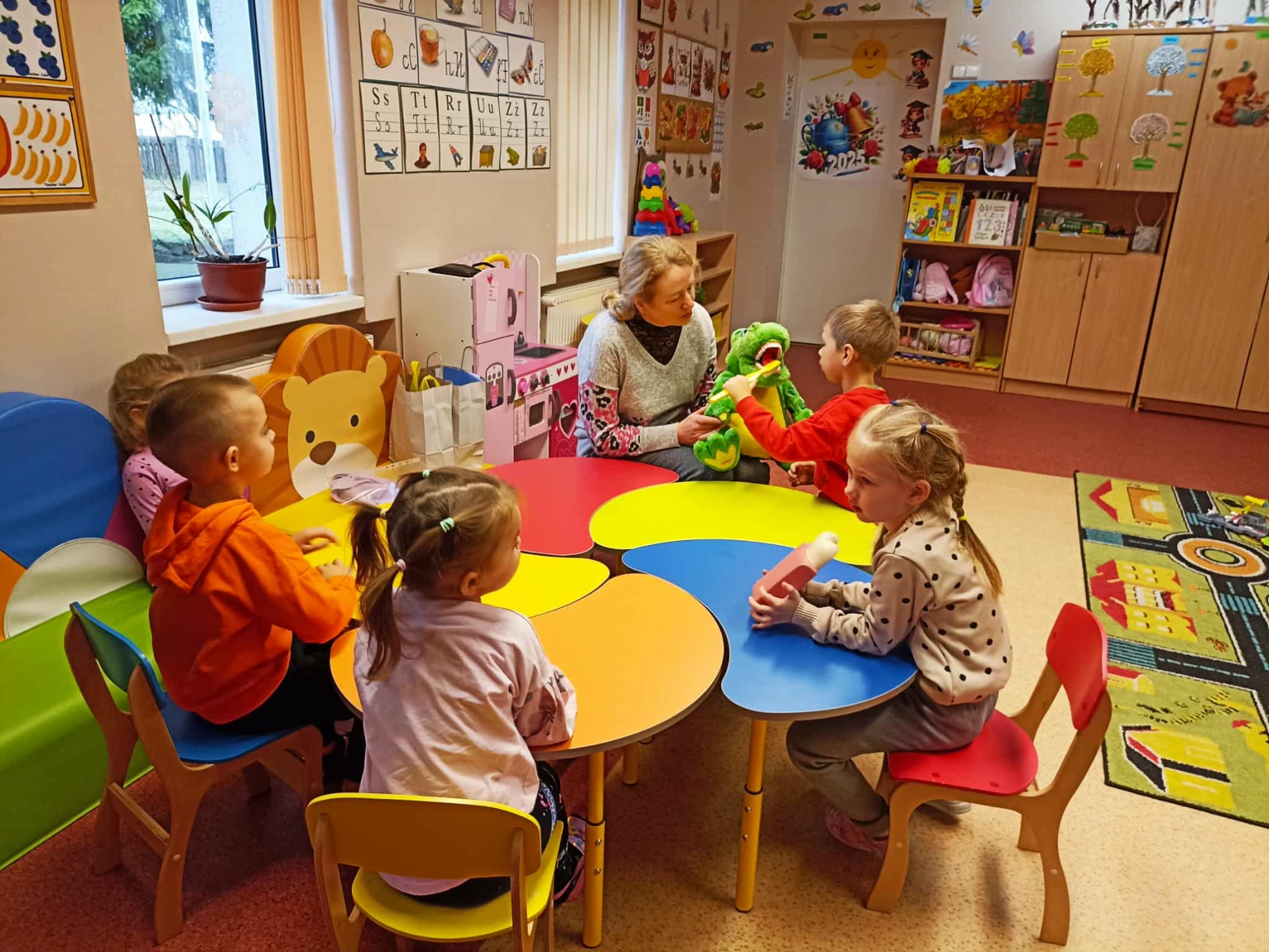 Su vaikais kalbėjomės apie burnos higieną. Jie sužinojo apie pagrindines rekomendacijas, kaip palaikyti sveikus dantis, įskaitant apnašas ir jų šalinimą, valymo priemones ir pirmąją pagalbą dantų traumų atveju.